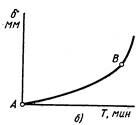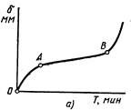 При изнашивании инструмента преимущественно по задней поверхности, когда износ передней поверхности незначителен, кривая износа (рис. 1, б) вогнута относительно оси абсцисс. В этом случае период приработки отсутствует и на участке АВ кривой износа, соответствующем периоду нормального изнашивания, износ вначале медленно, а затем более быстро возрастает до точки В начала периода катастрофического изнашивания.