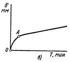 Если инструмент изнашивается одновременно по передней и задней поверхностям, то кривая износа задней поверхности (рис. 1, а) состоит из трех более или менее отчетливо выраженных участков. Участок ОА кривой с интенсивным нарастанием ширины площадки износа соответствует периоду приработки инструмента. При дальнейшей работе инструмента нарастание износа замедляется, так как это связано с уменьшением контактных касательных напряжений на площадке износа по мере увеличения ее размеров. Участок АВ кривой соответствует периоду нормального изнашивания инструмента. По достижении некоторой величины линейный износ задней поверхности вследствие роста температуры вновь начинает резко расти и кривая износа идет круто вверх. Участок кривой за точкой В соответствует периоду катастрофического изнашивания инструмента. В этом периоде износ нарастает настолько быстро, что если не прекратить дальнейшую работу, то это может привести к чрезмерно большому износу задней поверхности, при котором резко сократится число переточек, допускаемых инструментом, и увеличится время, затрачиваемое на переточку. Поэтому рациональная эксплуатация инструмента исключает работу в периоде катастрофического изнашивания.