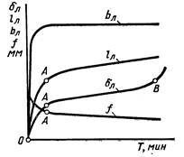 Изменение размеров лунки по мере изнашивания передней поверхности изображено на рис. 3. Длина bл лунки, равная рабочей длине главного лезвия, за все время работы инструмента остается одинаковой. Глубина dл лунки вначале возрастает быстро, затем ее рост замедляется и только после определенного периода работы инструмента вновь интенсивно возрастает. Таким образом, на кривой, характеризующей рост глубины лунки, наблюдаются периоды приработки, нормального и катастрофического изнашивания. Ширина lл лунки, как и ее глубина, вначале возрастает быстро, а затем ее рост замедляется. Перемычка f, если она имеется, интенсивно уменьшается при быстром росте ширины лунки. Когда же темп роста ширины лунки замедляется, то замедляется и уменьшение перемычки.