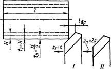 Пусть при обтачивании валика длиной l (рис. 1) необходимо срезать припуск размером H. Произведем обработку при двух режимах резания. При первом режиме глубина резания t1 = t будет равна припуску на обработку Н, а подача s1 = s. При втором режиме глубина резания tII = t/2 будет равна Н/2, а подача sII = 2s.