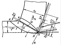 Режущий клин инструмента через площадку контакта шириной С действует на срезаемый слой толщиной а. Сосредоточенная сила R, с которой передняя поверхность инструмента давит на срезаемый слой, получила название силы стружкообразования. Линией ОК обозначена нейтральная линия, разграничивающая области сжимающих и растягивающих напряжений в обрабатываемом материале ниже поверхности резания. Левее нейтральной линии расположена область сжимающих напряжений, а правее - растягивающих.