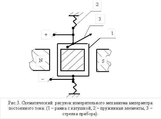 Силовые линии магнитного поля в кольцевом зазоре всегда направлены по нормали к поверхностям магнитных полюсов и магнитомягкой вставки. В кольцевом зазоре магнитной системы  размещается рамка с намотанной на ней катушкой проводника, содержащая n витков. Система крепления рамки показана на Рис.3. Рамка с катушкой 1 закреплена в зазоре магнитной системы амперметра с помощью пружинных элементов 2, механически связанных, но электрически изолированных от корпуса прибора. На рамке жестко закреплена стрелка 3  прибора. Катушка гибкими проводниками связана с зажимами «+» «-», служащими для включения прибора в электрическую цепь. Такое устройство обеспечивает протекание электрического тока только по измерительной катушке. Проводники, соединяющие рамку 1 с зажимами «+»,«-» не препятствуют вращению рамки.