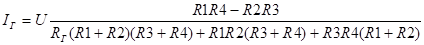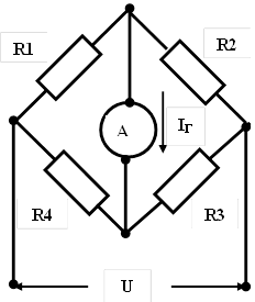Каждый из резисторов показанных на схеме является плечом моста. К диагоналям моста подключены источник питания U и гальванометр А. Гальванометр – это высокочувствительный амперметр, имеющий собственное сопротивление RГ. Силу тока IГ, протекающего через гальванометр можно рассчитать одним из способов, изложенных в учебниках физики.