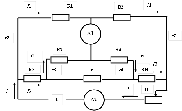 Одним из способов позволяющих снизить влияние соединительных проводов является использование двойного измерительного моста, его схема показана на Рис.2. Первый мост образуют резисторы R1,R2,R3,R4 сопротивления соединительных проводов r1,r2.r3,r4, включены последовательно с основными сопротивлениями моста. Номиналы сопротивлений первого моста больше 10 Ом, что позволяет пренебречь ошибкой вносимой соединительными проводами. При таком способе измерения неизвестного сопротивления RX его значение рассчитывается по формуле