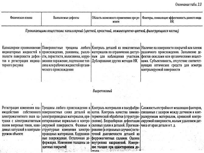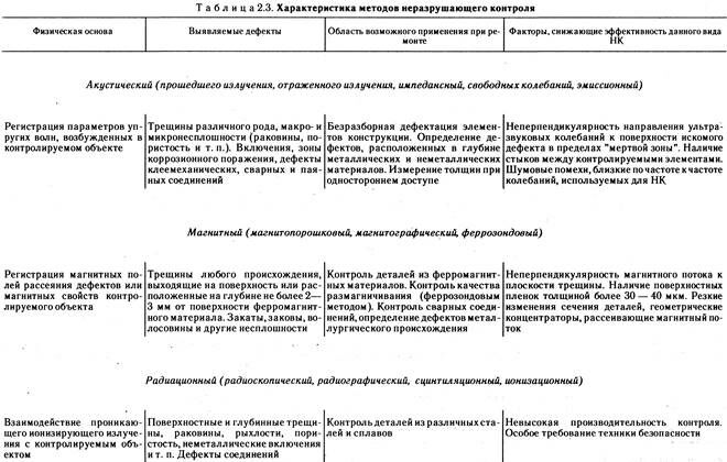 В этих случаях используются физические методы неразрушающего контроля (НК). В настоящее время известны следующие основные виды неразрушающего контроля: акустический, магнитный, радиационный, капиллярный и вихретоковый. Их краткая характеристика приведена в табл. 2.3.
