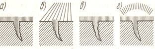 Рис. 2.13. Схема капиллярной дефектоскопии: а. — нанесение индикаторной жидкости; б — удаление излишков жидкости; в — нанесение проявляюще смеси; г — наблюдение индикаторного рисунка