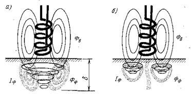 а — монолитный металл; б — металл с трещиной; Фв — возбуждающее электромагнитное поле; Фф — наведенное электромагнитное поле;Iф — вихревые тони; Д — глубина проникновения