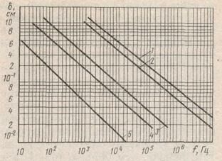 Рис. 2.15. Номограмма для определения глубины б проникновения вихревых токов (по данным А. Л. Дорофеева):