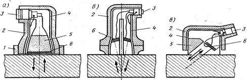 Рис. 2.6. Конструкция нормального (а), раздельно-совмещенного (б) и наклонного (в) искателей: 1 — протектор;2 — корпус;3 — штепсельный разъем; 4 — экран;5 — демпфер; 6 — пьезопластина. Стрелками обозначают направление ультразвукового сигнала