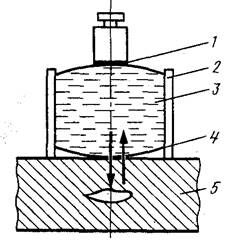 Рис. 2.7. Схема искателя с локальной ванной: 1 — пьезоэлемент; 2 — корпус; 3 — иммерсионная жидкость; 4 — эластичная мембрана; 5 — изделие