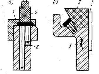 Чтобы обеспечить ультразвуковой контроль деталей сложной конфигурации, необходимо фиксировать нормальные или наклонные искатели в строго определенном месте контактной поверхности. Для этого рекомендуется изготавливать специальные фиксирующие приспособления, обеспечивающие ввод УЗК в тело детали в строго определенном направлении с учетом геометрических особенностей контрольного участка и характера искомого дефекта (рис. 2.8).