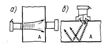 При контроле деталей используется ряд методов акустической дефектоскопии. При контроле по методу прошедшего излучения (теневом) УЗК, как правило, вводятся с одной стороны, а принимаются с другой (рис. 2.9, а), а в зеркальном варианте (рис. 2.9, б) вводятся и принимаются с одной стороны, так как УЗК, встретившие на пути дефект в виде несплошности, отражаются в обратном направлении, что приводит к уменьшению амплитуды либо изменению базы УЗК, воспринимаемых приемным элементом искателя. В общем случае для контроля УЗК могут излучаться в непрерывном или импульсном режиме.