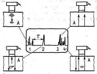 рис. 2.10. Схема акустического контроля объекта А по методу отраженного излучения: 1 — начальный импульс; 2 — импульс от дефекта; 3 — донный импульс; 4 — многократно отраженные импульсы; τ — временной интервал