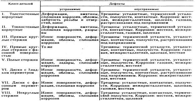 Учитывая, что каждому классу деталей присущи конструктивные особенности и определенные условия эксплуатации, можно ориентировочно установить характерные дефекты деталей каждого класса. В табл. 2.1 приведены примеры вышеуказанной классификации.