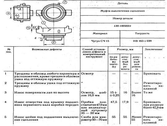 Технические условия (ТУ) на контроль и сортировку деталей в условиях авторемонтного производства разрабатываются на основании анализа условий работы детали, физико-механических свойств, перечня возможных дефектов и др. Они составляются в виде карт (табл. 2.2), которые по каждой детали в отдельности содержат следующую информацию: наименование детали и номер по каталогу, перечень дефектов, способы их выявления и рекомендуемые способы устранения, эскиз с указанием мест расположения дефектов, размеры детали, материал, твердость.