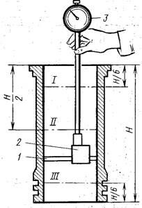 измеряют цилиндр в плоскости, параллельной оси коленчатого вала, в трех сечениях.