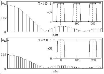 Зададим периодическую последовательность импульсов и разложим импульс на одном периоде Т в ряд Фурье (формула 3.2.2). Не меняя положения импульса на интервале Т, увеличим значение Т в два раза (продлеваем интервал нулями), при этом выражение (3.2.2) для вычисления спектра остается без изменения, но по ней рассчитывается в 2 раза большее количество гармоник с уменьшением в 2 раза частоты первой гармоники и шага Dw=2p/T. Увеличение интервала Т не влияет на результаты вычисления интеграла функции (3.2.2), т.к. интервал продления заполнен нулевыми значениями сигнала.