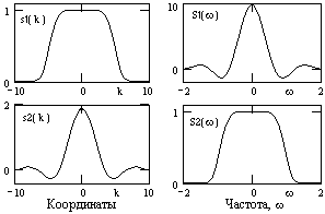 Таким образом, произведение функций в координатной форме отображается в частотном представлении сверткой фурье-образов этих функций, с нормировочным множителем (1/2p), учитывающем несимметричность прямого и обратного преобразования Фурье функций s(t) и h(t) при использовании угловых частот.