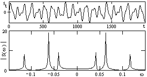 Сигнальную функцию s(t) в преобразованиях Лапласа обычно называют оригиналом, а ее спектральную функцию S(p) - изображением оригинала. Пример спектральной функции Лапласа для оригинала - сложного и неограниченного во времени сигнала, состоящего из каузальной суммы трех гармоник, приведен на рис. 3.2.7. По спектральной функции Лапласа можно выделить эти три основных частоты сигнала и оценить соотношение их амплитуд. Ширина пиков спектральной функции при выделении "чистых" гармоник зависит от значения коэффициента 'c' и уменьшается при его уменьшении.
