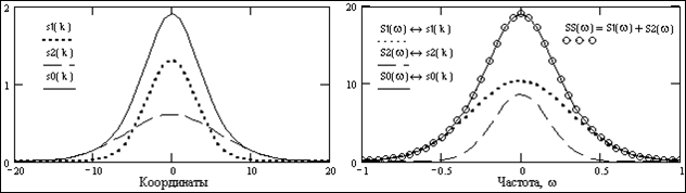 Рис. 3.2.1. Сигналы и их спектры.  s0(k)=s1(k)+s2(k) Û S1(w)+S2(w) = S0(w).
