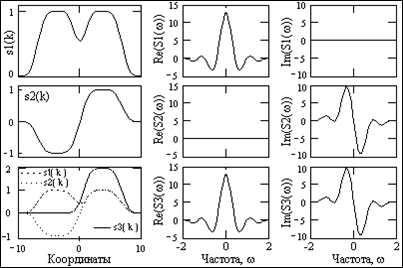 На рис. 3.2.2. приведены примеры, поясняющие свойства четности преобразования. Сигнал s1(k) является четным, s1(k) = s1(-k), и имеет только вещественный  четный спектр (мнимая часть спектральной функции представлена  нулевыми значениями).   Сигнал s2(k) = -s2(-k)  нечетный и имеет мнимый нечетный спектр, а нулевыми значениями представлена его действительная часть. Сигнал s3(k) образован суммой сигналов s1(k) и s2(k). Соответственно, спектральная функция сигнала представлена и действительной четной частью (принадлежащей s1(k)), и мнимой нечетной частью (принадлежащей s2(k)). При обратном преобразовании Фурье раздельно действительной и мнимой части спектра S3(w), равно как и любых других комплексных спектров, будут раздельно восстановлены четная и нечетная части исходного сигнала.