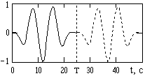 На рис. 3.2.2 сплошной кривой приведен пример непрерывного сигнала s(t), энергия которого сосредоточена на конечном интервале T = (0,25). Если нас не интересует форма данного сигнала за пределами интервала Т, то спектр сигнала в виде ряда Фурье можно определить по формуле (3.2.2). При обратном преобразовании Фурье по формуле (3.2.1), т.е. при восстановлении сигнала по его спектру,  в интервале Т будет восстановлен исходный сигнал s(t). Но если интервал для восстановления будет задан больше интервала Т, например равным 0-2Т, то за пределами этого интервала начнется периодическое повторение исходного сигнала, как это показано пунктиром на рис. 3.2.2. Если такой процесс нежелателен и за пределами интервала Т должны быть сохранены нулевые значения сигнала, то необходимо использовать интегральное преобразование Фурье  (3.2.1, 3.2.2). При этом следует учитывать особенности интегрального преобразования.