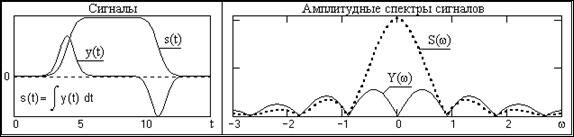 Оператор интегрирования в частотной области (1/jw) при w>1 ослабляет в амплитудном спектре высокие частоты и при w<1 усиливает низкие. Фазовый спектр сигнала смещается на -900 для положительных частот и на 900 для отрицательных.  Пример модуля спектра сигнала и его интегральной функции приведены на рис. 3.2.5.