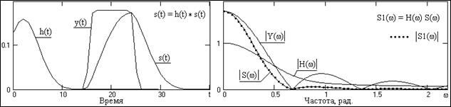 Пример выполнения свертки в частотной области приведен на рис. 3.2.6. Отметим, что частотное представление H(w) импульсного отклика h(t) линейной системы (или соответствующей линейной операции) имеет смысл частотной передаточной функции системы и позволяет определить сигнал на выходе системы (в частотной форме представления) при задании произвольного сигнала (в частотной форме) на ее входе. По существу, функция H(w) представляет собой распределение по частоте коэффициента пропускания частотных составляющих сигнала с входа на выход системы (операции).