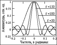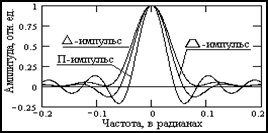 Спектр треугольного импульса также имеет лепестковую структуру с шириной лепестков 4p/r. Соответственно, база треугольного импульса равна 4p. Спектральная функция за счет квадратирования интегрального синуса имеет только положительные значения.