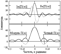 Как видно на рисунке, спектр сигнала, несимметричного относительно t = 0, имеет две части: четную действительную A(w) = Re(П(w)), и нечетную мнимую B(w) = Im(П(w)),. Модуль спектра R(w) = |П(w)| всегда четный, имеет только положительные значения и полностью повторяет |Пr(w)| четного импульса (при смещении начала координат в центр импульса).