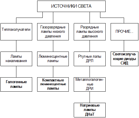 Из всего разнообразия источников света в настоящем учебном пособии рассматриваются источники света, которые применяются для освещения производственных, административно-бытовых, общественных, жилых и других помещений, а также для освещения территорий предприятий и уличного освещения.