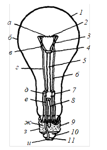 5 – штабик; 6 – электроды; 7 – лопатки; 8 – штангель; 9 – цоколь; 10 – изолятор; 11 – нижний контакт. Материалы: а – вольфрам;