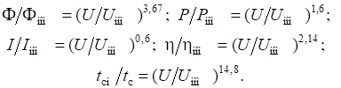 Как видно из уравнений 2.7, с ростом напряжения на лампе резко увеличивается сила тока, мощность, световой поток и световая отдача, но уменьшается средний срок службы. При небольших отклонениях напряжения в сети (до 7,5 %) можно приближенно считать, что отклонение напряжения ±1 % изменяет световой поток лампы на 2,7 %, а среднюю продолжительность горения на ±14 %.