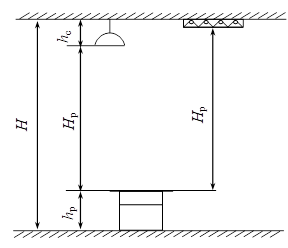 На рисунке 6.1 показано расположение  светильников общего освещения по высоте помещения. Минимальная высота подвеса светильников над освещаемой поверхностью определяется условиями ограничения ослепленности. Большинство помещений общественных зданий имеют высоту 2,5…3 м, поэтому высота подвеса ограничивается высотой помещения.