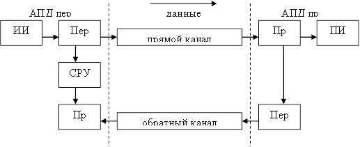 Обратная связь – обратный канал, по которому передаются служебные сигналы взаимодействия от принимающей АПД к передающей. Область применения без ОС ограничена, т.к. при ПД используют двухсторонние каналы, позволяющие вести передачу в прямом и обратном направлении. Наиболее эффективны системы с ОС. По каналу ОС на передающую АПД поступает информация об ошибках, обнаруженных в приемной АПД. Имея эти сведения, АПД передачи может подстраиваться в зависимости от количества приема, т.е. изменить избыточность передачи в зависимости от наличия и количества ошибок на приеме. Если в данный момент ошибки отсутствуют, избыточность, вводимая АПД передачи в исходную информацию, будет минимальна, а пропускная способность максимальна. При появлении ошибок избыточность передачи возрастает, чтобы обеспечить заданную верность ПД. Т.е. наличие ОС позволяет автоматически регулировать избыточность передачи в зависимости передачи от количества работы канала связи. Обратный канал используется не только для передачи информации об ошибках, но и для передачи обратного потока данных.
