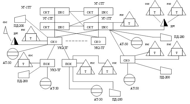 В каждый узел УК-1 включаются узлы  УК–2 и УК –3, расположенные  на его территории. Каждый узел   УК–2 имеет связь не менее чем с двумя  УК–1 или ГУ. Прямая связь между узлами УК-2 организуются при достаточном тяготении.  В узлах УК–2 устанавливаются оконечные станции  коммутации каналов (СКО), которые обеспечивают обработку на сетях  абонентского телеграфа АТ, ПД и передачи сообщений ПС. На узлах  УК–3 устанавливается подстанция коммутации  каналов (ПСК), которая концентрирует нагрузку от сельских отделений связи (СОС), не загруженных   ГОС, а также от абонентов АТ и ПД своей территории.
