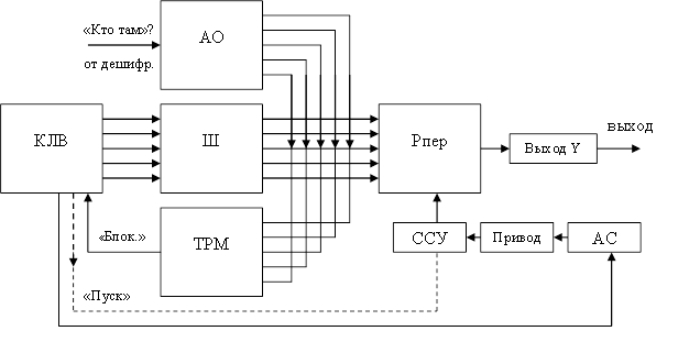 Вводное устройство в зависимости от того,  какой символ выбран для передачи выбирает на одном из своих выходов сигнал, управляющий работой кодирующего устройства. Получив этот сигнал, кодирующее устройство преобразует его в соответствующую n-элементную кодовую комбинацию. КК поступает в наборное устройство, где фиксируется в двоичном коде, и далее передается в преобразованном виде в последовательном коде. Преобразование происходит под действием вращающегося распределителя. Здесь же под действием распределителя формируется полная КК с добавлением стартовой и стоповой посылок. В выходном устройстве КК преобразуется в посылки электрического тока, которые преобразуются в линию.