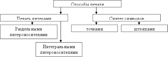 При классификации способов печати, признак первой группы – печать каждого из символов – производится отдельной литерой. Вторая группа характеризуется тем, что любой символ составляется из отдельных элементов, являющихся общими для всех символов таблицы. Эти способы печати называются матричными или мозаичными. Способы печати с помощью литер подразделяются по виду литероносителя. В печатающем устройстве с раздельными литероносителями число таких носителей равно числу печатаемых кодовых комбинаций. На каждом литероносителе имеется 2 или 3 литеры (по числу регистров кода), соответствующие данной кодовой комбинации. В результате дешифрации принятой комбинации выбирается один из литероносителей, тем самым обеспечивая печать нужного символа.