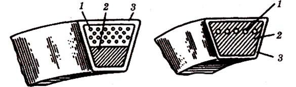 Большую гибкость и нагрузочную способность имеют кордошнуровые ремни, у которых верхний растягиваемый слой состоит из одного ряда анидных шнуров (намотанных по винтовой линии), заключенных в слой мягкой резины.