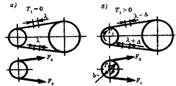 На рисунке 8.5 показано нагружение ветвей ремня в двух случаях: T1= 0 (рисунок 8.5, а) и Т1 > 0 (рисунок 8.5, б). Принятые обозначения: F0 – предварительное натяжение ремня; F1 и F2 – натяжение ведущей и ведомой ветвей в нагруженной передаче;