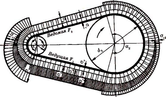 Напряжения в ремне. Наибольшие напряжения создаются в ведущей ветви ремня. Они складываются из