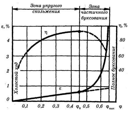 наблюдается как упругое скольжение, так и буксование. Они разделяются продолжением прямой ε штриховой линией.