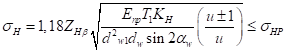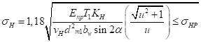 Поэтому расчет контактных напряжений принято выполнять при контакте в полюсе зацепления (рисунок 11.7). Контакт зубьев рассматривают как контакт двух цилиндров с радиусами ρ1 и ρ2. Контактные напряжения определяют по формуле (1.4)