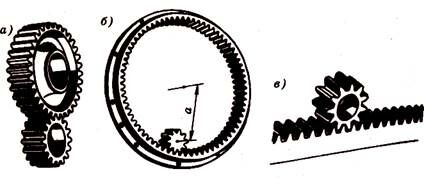 По расположению осей валов различают: передачи с параллельными осями, которые выполняют с цилиндрическими колесами внешнего или внутреннего зацепления (рисунок 11.1, а, б); передачи с пересекающимися осями – конические колеса (рисунок 11.14); передачи со скрещивающимися осями – червячные (рисунок 11.19). Кроме того, применяют передачи между зубчатым колесом и рейкой (рисунок 11.1, в).