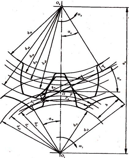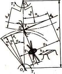 = d – 2,5m – диаметр окружностей впадин; А1А2 – линия зацепления (общая касательная к основным окружностям); qa – длина активной линии зацепления (отсекаемая окружностями выступов); П – полюс зацепления (точка касания начальных окружностей и одновременно точка пересечения линии центров колес О1O2 с линией зацепления).