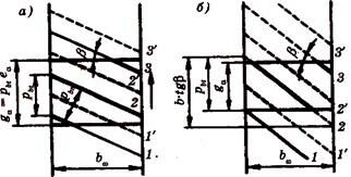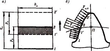 а и изменение нагрузки по профилю зуба. При вращении колес (рисунок 11.2) линия контакта зубьев перемещается в поле зацепления (рисунок 11.3, а), у которого одна сторона равна длине активной линии зацепления qa, а другая – рабочей ширине зубчатого венца bw . Если линия контакта 1 первой пары зубьев находится в начале поля зацепления, тогда при рb < qa в поле зацепления находится еще и линия контакта 2 второй пары зубьев. При вращении колес линии 1 и 2 перемещаются в направлении, показанным стрелкой. Когда вторая пара придет на границу поля 2', первая пара займет положение Г. При дальнейшем движении на участке 1' – 2 в зацеплении находится только одна пара зубьев. Одно непарное зацепление продолжается до тех пор, пока пара 1 не займет положение 2. В этот момент в зацепление вступит следующая пара зубьев и снова начнется двухпарное зацепление.