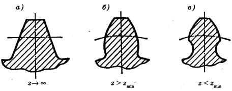 Влияние числа зубьев на форму и прочность зуба. Для уменьшения габаритов зубчатой передачи применяют колеса с малым числом зубьев. Изменение числа зубьев приводит к изменению формы зуба. У рейки, когда z– ∞, зуб прямобочный (рисунок 11.4, а). С уменьшением z увеличивается кривизна эвольвентного профиля, а толщина зуба у основания и у вершины уменьшается (рисунок 11.4, б). При уменьшении z ниже предельного появляется подрез ножки зуба режущей кромкой инструмента, в результате чего прочность зуба резко уменьшается (рисунок 11.4, в). Из-за среза части эвольвенты у ножки зуба уменьшается длина рабочего участка профиля, в результате чего уменьшается коэффициент торцевого перекрытия