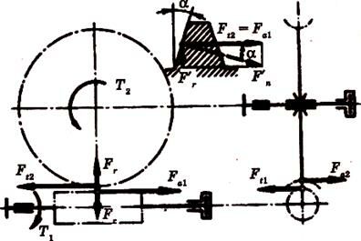(проекция нормальной силы на осевую плоскость). Т1 -- момент на червяке, Т2 — момент на колесе: