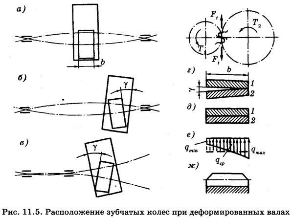 На рисунке 11.5 изображено взаимное расположение зубчатых колес при деформированных валах в случаях: симметричного (рисунке 11.5, а), несимметричного (рисунке 11.5, б) и консольного (рисунке 11.5, в) расположения колес прогибаются в противоположные стороны под действием сил в зацеплении. При несимметричном и консольном расположении опор колеса перекашиваются на угол у, что приводит к нарушению правильного касания зубьев. Если бы зубья были абсолютно жесткими, то они соприкасались бы только своими концами (рис. 11.5, г, на котором изображено сечение зубьев плоскостью зацепления). Деформация зубьев уменьшает влияние перекосов и в большинстве случаев сохраняет их соприкосновение по всей длине (рис. 11.5, д). Однако при этом нагрузка перераспределяется в соответствии с деформацией отдельных участков зубьев (рис. 11.5 е). Отношение