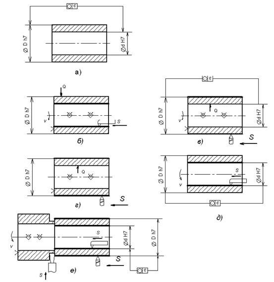 2). Базировка по внешней поверхности и обработка внутренней поверхности, обеспечивается соосность (рис. 3.1.д)